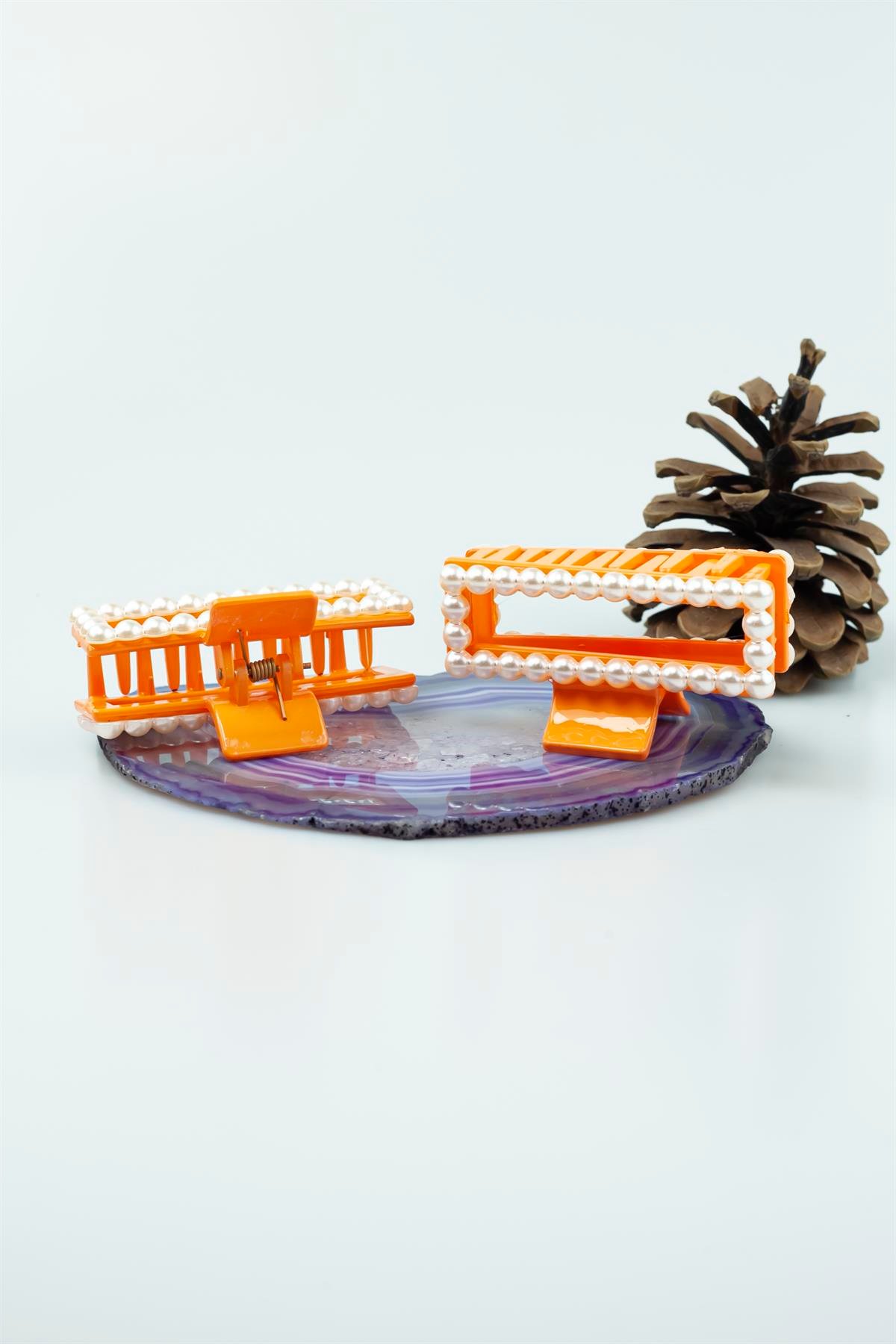 Turuncu Renk İncili Dikdörtgen Tasarım Kıskaçlı Toka 4901
